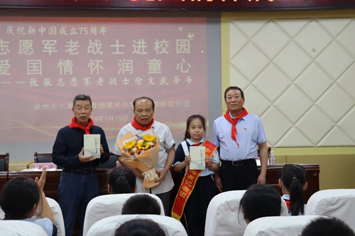 徐爺爺還將其新近出版的《抗美援朝詩(shī)集》分別贈(zèng)送給徐州市小海燕記者團(tuán)總部和星光小學(xué)湖北路校區(qū)分團(tuán),并題詞留念。為徐州市小海燕記者團(tuán)總部的題詞是:展翅搏擊風(fēng)雨 迎接時(shí)代大潮;為星光小學(xué)湖北路校區(qū)分團(tuán)的題詞是:弘揚(yáng)愛(ài)國(guó)精神 傳承紅色基因。