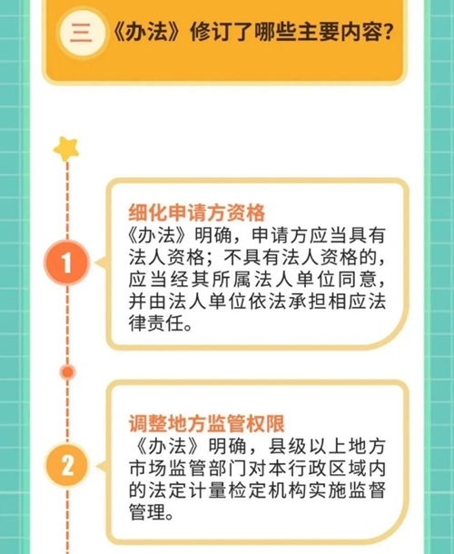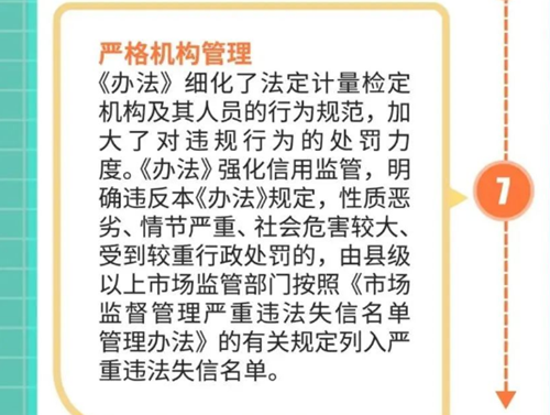 《辦法》修訂以問(wèn)題為導(dǎo)向,聚焦法定計(jì)量檢定機(jī)構(gòu)長(zhǎng)期存在的痛點(diǎn)、堵點(diǎn)問(wèn)題,明確機(jī)構(gòu)職責(zé),完善管理制度,鼓勵(lì)加強(qiáng)技術(shù)和應(yīng)用研究,推動(dòng)產(chǎn)業(yè)發(fā)展,主要修改內(nèi)容如下:一是明確定位。《辦法》規(guī)定了法定計(jì)量檢定機(jī)構(gòu)和專(zhuān)業(yè)計(jì)量站的定義,明確專(zhuān)業(yè)計(jì)量站屬于法定計(jì)量檢定機(jī)構(gòu)的重要組成部分,明晰機(jī)構(gòu)法定職責(zé),細(xì)化專(zhuān)業(yè)計(jì)量站的定位和申請(qǐng)要求。二是強(qiáng)化主體責(zé)任。《辦法》鼓勵(lì)法定計(jì)量檢定機(jī)構(gòu)通過(guò)官方網(wǎng)站或其他方式,對(duì)其遵守法定要求、獨(dú)立公正開(kāi)展量值傳遞和溯源工作、履行社會(huì)責(zé)任、嚴(yán)守誠(chéng)實(shí)信用,以及收費(fèi)標(biāo)準(zhǔn)等情況進(jìn)行自我聲明;要求法定計(jì)量檢定機(jī)構(gòu)定期將履行職責(zé)情況及統(tǒng)計(jì)數(shù)據(jù)信息等及時(shí)向市場(chǎng)監(jiān)管部門(mén)報(bào)告。三是完善監(jiān)管制度。《辦法》對(duì)法定計(jì)量檢定機(jī)構(gòu)實(shí)施分類(lèi)監(jiān)管,引入能力評(píng)價(jià)和確認(rèn)制度;針對(duì)社會(huì)普遍反映的虛假證書(shū)、報(bào)告問(wèn)題,《辦法》明確法定計(jì)量檢定機(jī)構(gòu)應(yīng)當(dāng)采取防偽措施,供有關(guān)部門(mén)、利益相關(guān)方和社會(huì)公眾查驗(yàn)證書(shū)、報(bào)告的真?zhèn)巍?strong>四是增加鼓勵(lì)條款。《辦法》鼓勵(lì)法定計(jì)量檢定機(jī)構(gòu)加強(qiáng)應(yīng)用計(jì)量技術(shù)研究,為企業(yè)技術(shù)研發(fā)和質(zhì)量提示提供計(jì)量支持,加強(qiáng)民生計(jì)量、誠(chéng)信計(jì)量體系建設(shè),開(kāi)展計(jì)量風(fēng)險(xiǎn)收集、評(píng)估、識(shí)別、預(yù)警。五是嚴(yán)格法律責(zé)任。《辦法》進(jìn)一步細(xì)化對(duì)法定計(jì)量檢定機(jī)構(gòu)及其人員的要求,以及機(jī)構(gòu)的禁止行為,并調(diào)整相應(yīng)罰則,加大違法處罰力度;強(qiáng)化信用監(jiān)管,對(duì)違反《辦法》規(guī)定,性質(zhì)惡劣、情節(jié)嚴(yán)重、社會(huì)危害較大、受到較重行政處罰的機(jī)構(gòu),依法列入嚴(yán)重違法失信名單。