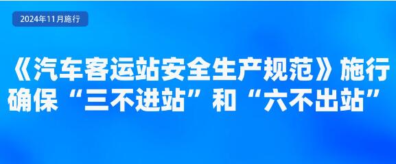 交通運輸部修訂印發(fā)《汽車客運站安全生產(chǎn)規(guī)范》,于2024年11月1日起施行!兑(guī)范》明確,汽車客運站經(jīng)營者應(yīng)當對進出汽車客運站候車區(qū)和發(fā)車區(qū)的人員和行李物品、車輛進行嚴格檢查,確保“三不進站”和“六不出站”。“三不進站”是指:危險品不進站、無關(guān)人員不進站(發(fā)車區(qū))、無關(guān)車輛不進站(發(fā)車區(qū))。“六不出站”是指:超載或違規(guī)裝載營運客車不出站、安全例行檢查不合格營運客車不出站、旅客未系安全帶不出站、駕駛員資格不符合要求不出站、營運客車證件不齊全不出站、“出站登記表”未經(jīng)審核簽字不出站。
