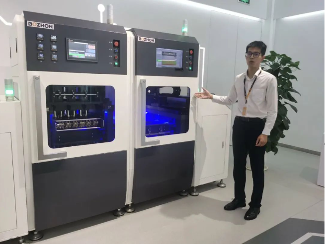 博眾精工工作人員向記者介紹其自動(dòng)脈沖熱壓焊接生產(chǎn)設(shè)備(左)和檢測(cè)設(shè)備(右)。該檢測(cè)設(shè)備解析度精確在100納米內(nèi),可檢測(cè)出連錫、偏移、短路、冷焊、空焊等異常狀況。
