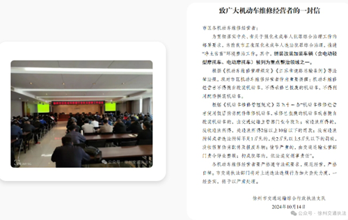不斷壓實企業(yè)主體責任。11月4日,召開徐州市區(qū)機動車維修行業(yè)執(zhí)法監(jiān)管工作會議,各轄區(qū)交通執(zhí)法大隊負責人、市區(qū)機動車維修企業(yè)負責人共160人參加會議,會議著重強調(diào)機動車維修經(jīng)營者不得拼裝改裝加裝車輛(含電動輕型摩托車、電動摩托車),并在會后對參會人員掌握有關(guān)技術(shù)標準和法律法規(guī)情況進行了測試。不斷加大執(zhí)法檢查力度。自“凈土佑苗”環(huán)境整治工作開展以來,交通執(zhí)法部門共出動執(zhí)法人員100余人,檢查維修企業(yè)56家,發(fā)現(xiàn)2家維修企業(yè)未依法備案,處罰一家,罰款3000元。
