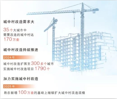 2024年,城中村改造擴圍至300多個城市,實施城中村改造項目1790個。2025年,為持續(xù)用力推動房地產(chǎn)市場止跌回穩(wěn),住房城鄉(xiāng)建設(shè)部將加力實施城中村和危舊房改造,推進貨幣化安置,計劃在新增100萬套城中村改造和危舊房改造的基礎(chǔ)上繼續(xù)擴大改造規(guī)模。