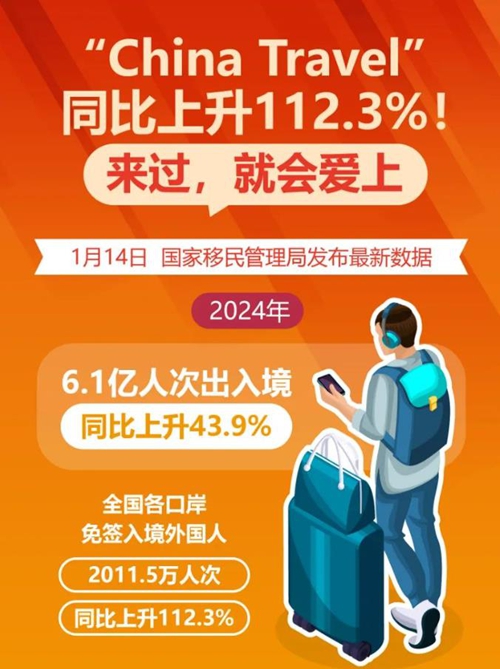 14日,國(guó)家移民管理局發(fā)布最新數(shù)據(jù):2024年,6.1億人次出入境,同比上升43.9%;全國(guó)各口岸免簽入境外國(guó)人2011.5萬(wàn)人次,同比上升112.3%。數(shù)據(jù)實(shí)證“China Travel”潛力無(wú)限。