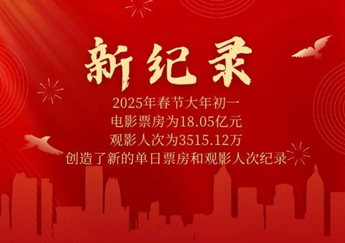 新華社記者從國家電影局獲悉,2025年春節(jié)大年初一(1月29日)票房為18.05億元,觀影人次為3515.12萬,均超過2021年春節(jié)大年初一,創(chuàng)造了新的單日票房和觀影人次紀錄。