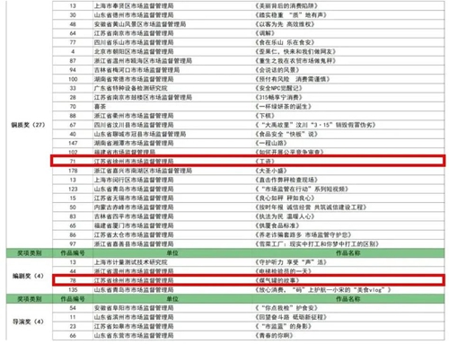 徐州市市場(chǎng)監(jiān)督管理局再度獲評(píng)年度“優(yōu)秀組織獎(jiǎng)”。經(jīng)過(guò)初審、復(fù)審及專家審議,由徐州局選送的《煤氣罐的故事》獲“編劇獎(jiǎng)”(徐州市市場(chǎng)監(jiān)管綜合行政執(zhí)法監(jiān)督局報(bào)送),《工資》獲“銅質(zhì)獎(jiǎng)”(市局信用監(jiān)督管理處報(bào)送)。