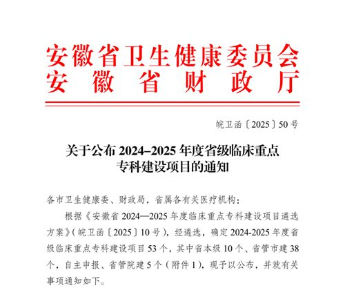 黃淮網(wǎng)(宋 梅 田 軍) 近日,安徽省衛(wèi)生健康委員會、安徽省財政廳聯(lián)合印發(fā)《關于公布 2024-2025年度省級臨床重點?平ㄔO項目的通知》(皖衛(wèi)函〔2025〕50 號),根據(jù)《安徽省2024—2025年度臨床重點?平ㄔO項目遴選方案》(皖衛(wèi)函〔2025〕10 號),經遴選,確定 2024-2025 年度省級臨床重點?平ㄔO項目53個,其中省本級10個、省管市建38個,自主申報、省管院建5個。其中,淮北礦工總醫(yī)院麻醉科順利通過各層評審環(huán)節(jié),成功入選安徽省2024-2025 年度省級臨床重點?平ㄔO項目名單。