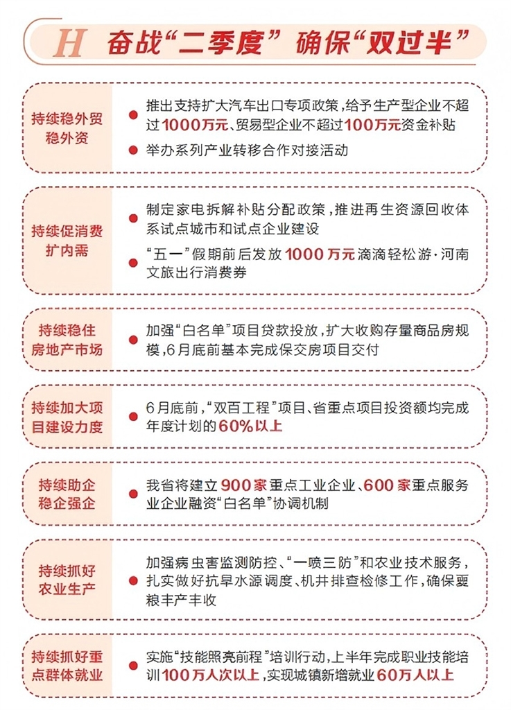 本報訊(記者 宋敏)二季度是承上啟下的關(guān)鍵時期,關(guān)鍵時期要下非常之力。記者4月28日獲悉,省政府辦公廳近日印發(fā)《奮戰(zhàn)二季度確保“雙過半”若干政策措施》(以下簡稱《措施》),圍繞穩(wěn)外貿(mào)、促消費、擴投資、強主體等方面推出24條政策措施,推動經(jīng)濟持續(xù)回升向好。