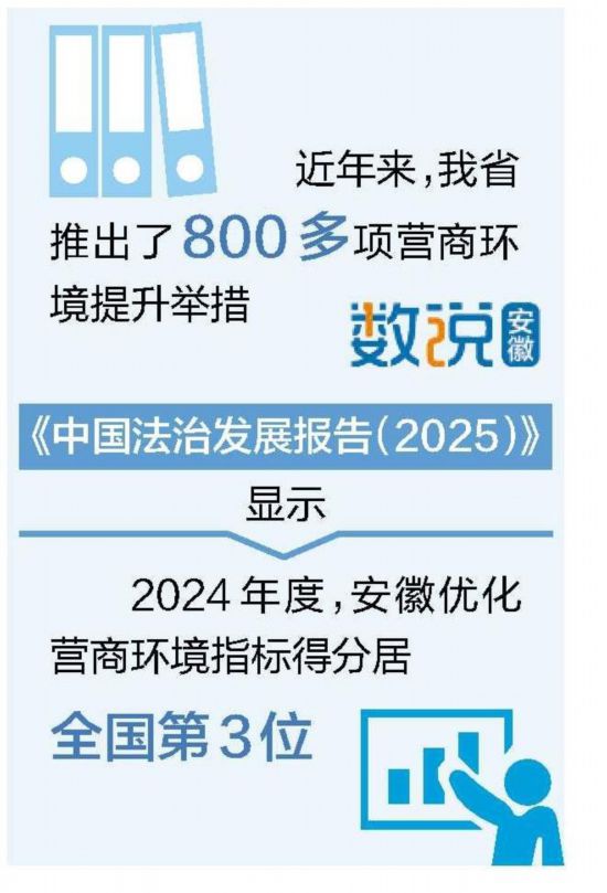 日前發(fā)布的《中國法治發(fā)展報告(2025)》顯示,2024年度,安徽優(yōu)化營商環(huán)境指標得分居全國第3位。