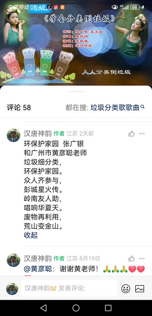 黃彥聰是廣東省廣州市的一位退休教師,在朋友圈里看到《垃圾分類組歌》,很敬佩他們?yōu)樯鐣?huì)公益事業(yè)做了一件大事。黃彥聰老師有感而發(fā),在評(píng)論欄寫(xiě)下這首贈(zèng)詩(shī)。