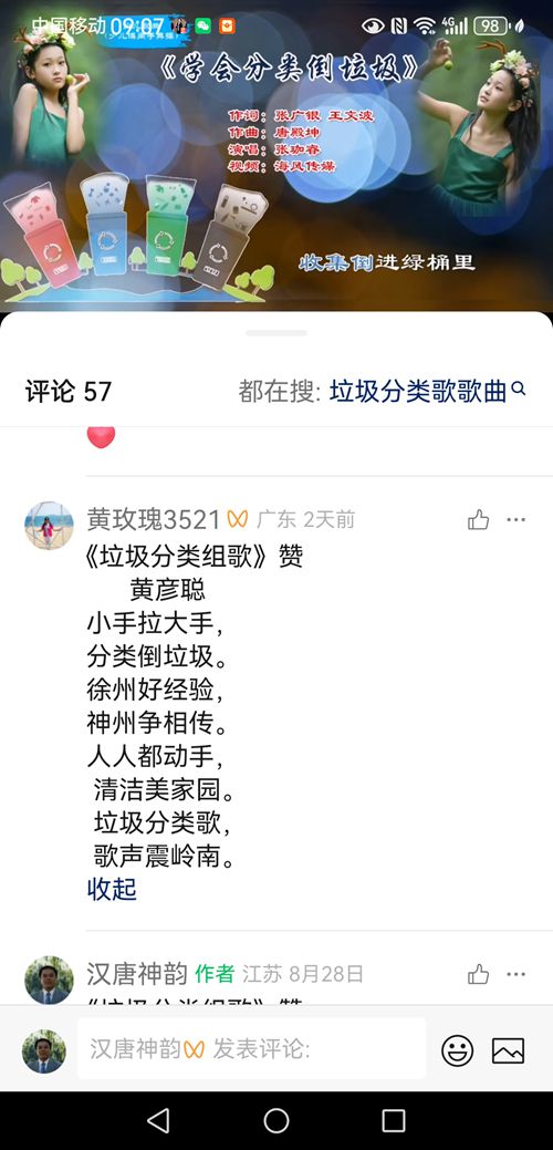 11月29日,廣東省廣州市網(wǎng)友黃彥聰在《組歌》視頻評(píng)論欄里以《垃圾分類組歌贊》為題寫(xiě)下一首贈(zèng)詩(shī):小手拉大手,分類倒垃圾。徐州好經(jīng)驗(yàn),神州爭(zhēng)相傳。人人都動(dòng)手,清潔美家園。垃圾分類歌,歌聲震嶺南。