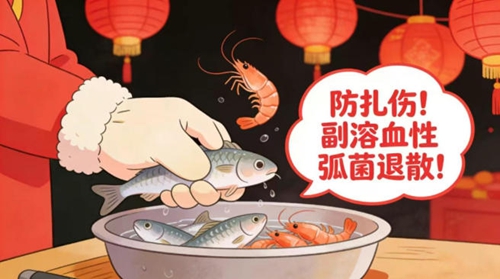 “年年有余”的魚蝦是年夜飯的重頭戲,不少人在剖魚、剪蝦時(shí)會(huì)不小心被魚刺、蝦殼扎傷手指。千萬別以為小傷口無關(guān)緊要,海鮮體表和黏液中常藏著“副溶血性弧菌”,它是一種“嗜鹽菌”,適宜在含鹽量2%-4%的環(huán)境生長,尤其喜歡海水和海產(chǎn)品。這種菌對(duì)熱敏感,80℃以上加熱1分鐘即可殺滅,但一旦通過傷口侵入人體,就可能引發(fā)感染,導(dǎo)致傷口紅腫、疼痛,并伴隨腹痛、腹瀉、嘔吐、發(fā)熱,嚴(yán)重時(shí)甚至?xí)鹈撍蛐菘,這也提醒我們處理水產(chǎn)品時(shí)必須格外謹(jǐn)慎。