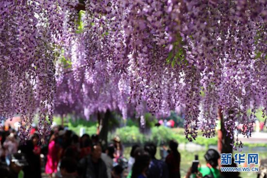 4月17日,游客在上海嘉定紫藤園賞花。近日,上海嘉定紫藤園百余棵紫藤進入盛放期,吸引眾多游客前來觀賞。 新華社記者 劉穎 攝