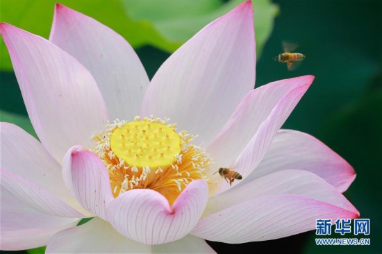 6月20日,在江蘇省盱眙縣陡湖蓮藕種植基地,兩只蜜蜂在荷花旁飛舞。夏至將至,各地荷花盛開,花香四溢,為炎炎夏日增添了詩意。 新華社發(fā)(周海軍 攝)