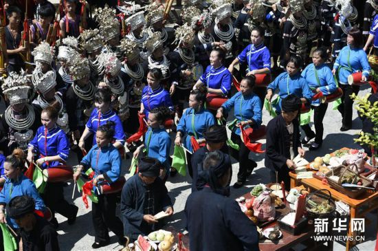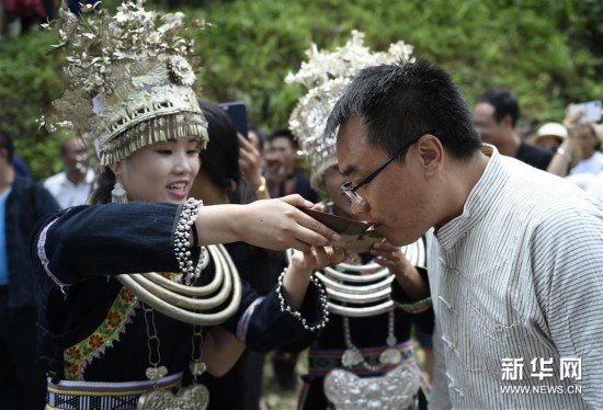 7月18日,錦屏縣彥洞鄉(xiāng)瑤白村村民向遠(yuǎn)道而來(lái)的客人獻(xiàn)上攔門(mén)酒。