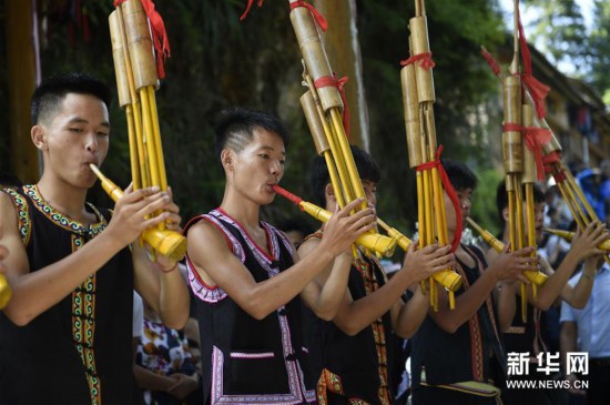 7月18日,錦屏縣彥洞鄉(xiāng)瑤白村村民在吹蘆笙迎接賓客。