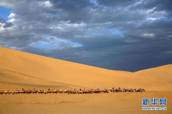 7月29日,游客在甘肅省敦煌市鳴沙山月牙泉景區(qū)參觀游覽。 當(dāng)日,甘肅省敦煌市鳴沙山月牙泉景區(qū)云景如畫,美不勝收,游客徜徉其中,盡情欣賞大漠風(fēng)光。 新華社發(fā)(張曉亮 攝)
