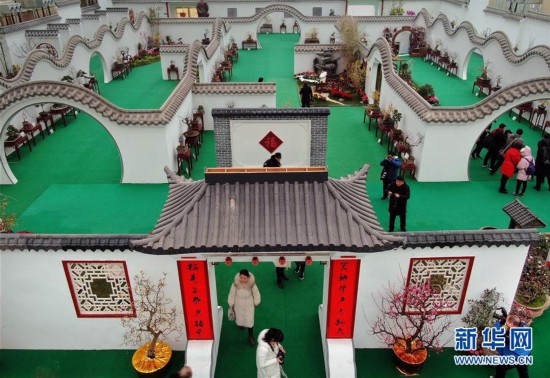 1月19日,游客在河南省鄢陵縣一處梅園內(nèi)的精品梅花展區(qū)參觀(無人機拍攝)。 新華社記者李安攝