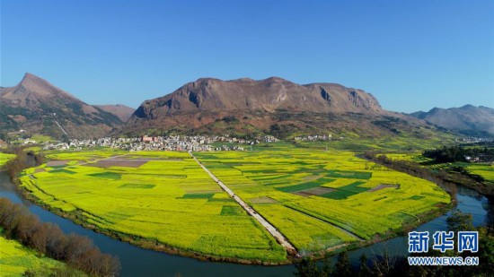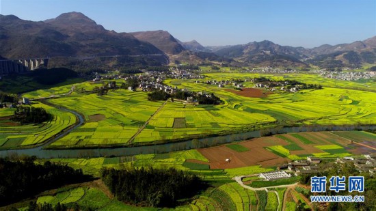 初春時(shí)節(jié),云南曲靖市羅平縣的油菜花盛開,黃花、碧水、群山、村舍相映成趣,透出濃濃春意。