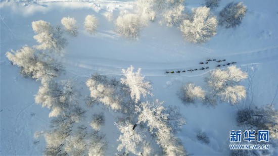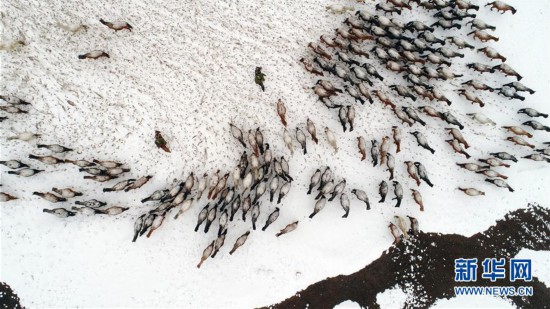 牧民踩著古老的毛皮滑雪板行進(jìn)在新疆阿勒泰地區(qū)的雪原上(1月7日無(wú)人機(jī)拍攝)。