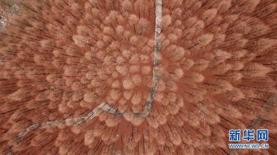江蘇省淮安市洪澤區(qū)蔣壩鎮(zhèn)一片杉樹(shù)林在薄雪覆蓋下(1月10日無(wú)人機(jī)拍攝)。