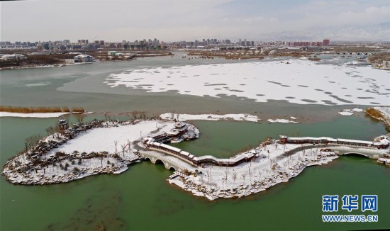 這是寧夏銀川市閱海灣商務(wù)區(qū)附近雪景(2017年2月21日無(wú)人機(jī)拍攝)。