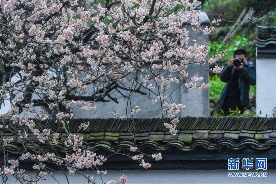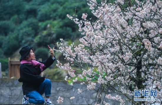 3月14日,游客在三都鎮(zhèn)烏祥村拍攝盛開的櫻花。 新華社記者 徐昱 攝