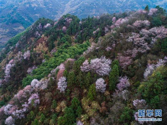 三都鎮(zhèn)烏祥村山坡上盛開的櫻花(3月14日無人機拍攝)。 新華社記者 徐昱 攝