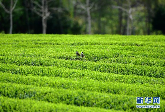 3月26日,兩只小鳥停留在生態(tài)茶園里的茶樹上。