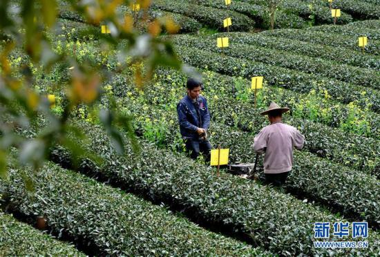 3月26日,在武夷山市星村鎮(zhèn)的生態(tài)茶園,茶農(nóng)們把種在茶樹間的油菜花打成肥料施肥。