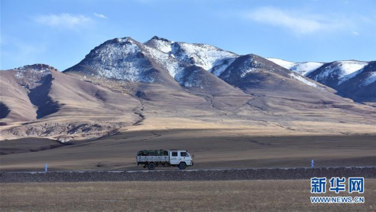 西藏那曲市申扎縣境內(nèi),一輛卡車從山前駛過(10月12日攝)。 新華社記者 周錦帥 攝
