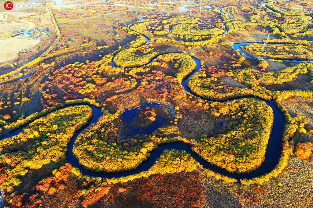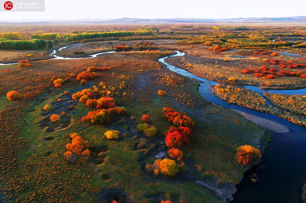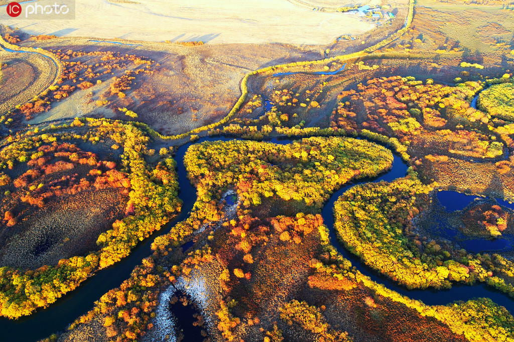 航拍內(nèi)蒙古金秋彎曲的扎敦河 滿眼金黃美不勝收