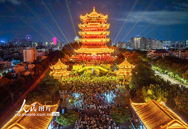 2025年8月20日晚,湖北武漢黃鶴樓景區(qū)《夜上黃鶴樓》沉浸式演出吸引大量游客前往游玩。薛婷攝(人民圖片網(wǎng))