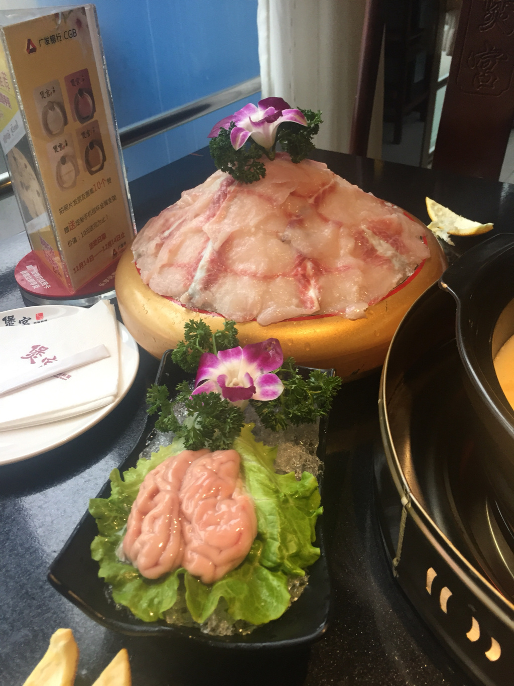 魚片超薄,放在冰上保持其鮮度,放在鍋里涮30秒魚片的顏色就會變成乳白色,口感佳