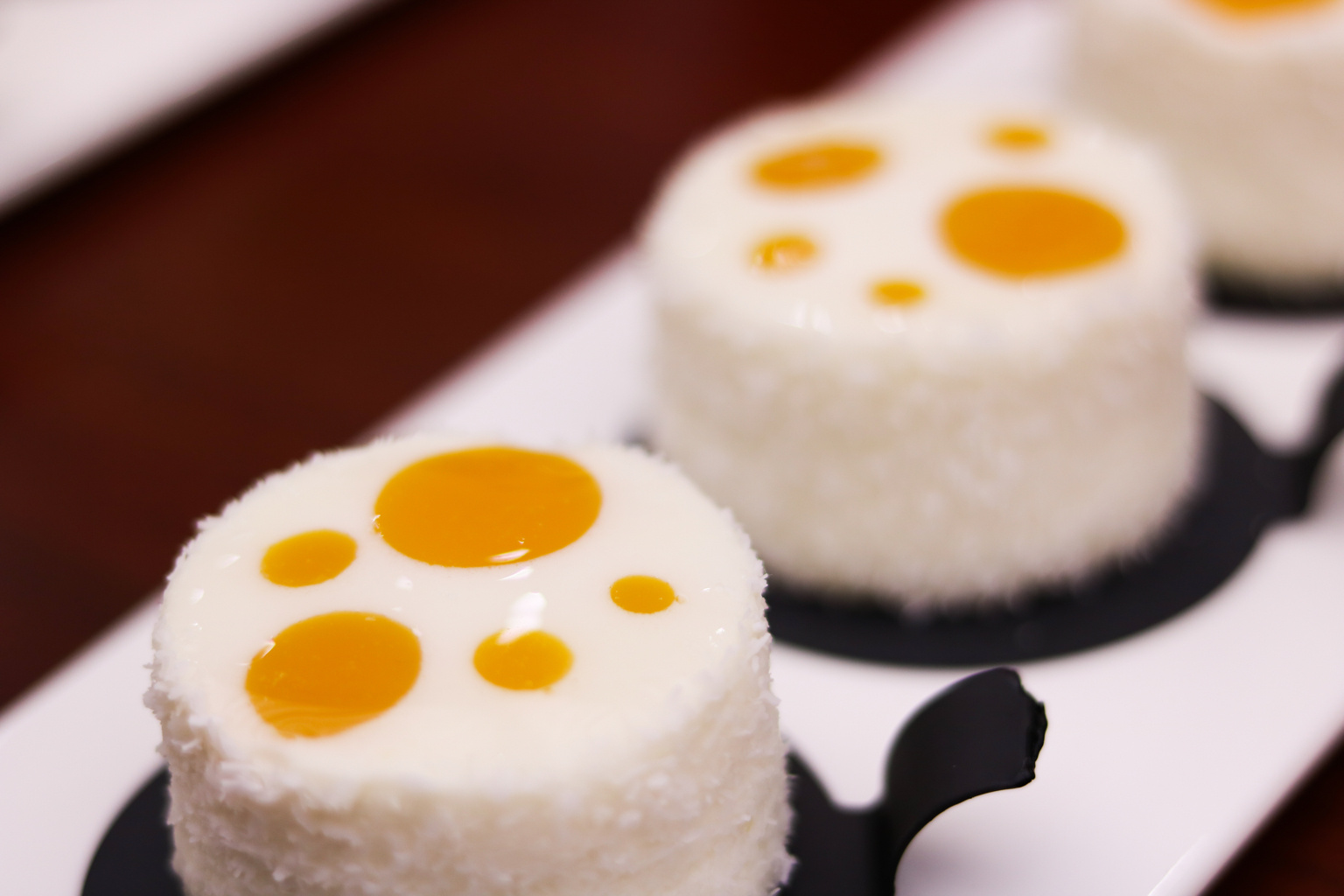 蘿莉塔:橙黃色的明亮主基調(diào)搭配兩朵可愛的小雛菊,恰似一個可愛小蘿莉。酸奶加上檸檬,佐以草莓醬。檸檬的鏡面層看上去輕巧華麗。剛?cè)肟谒幔斦捉罆r,草莓醬的甜才真正被激發(fā)出來,整體輕盈順滑,就像蘿莉樣的輕巧可人。蘿莉塔真的名至實歸。