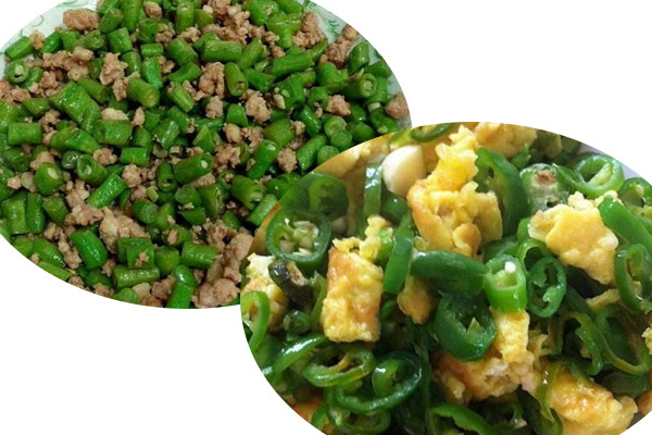 做法:把青椒切好,豆角摘好,蛋炒香后起鍋炒青椒,青椒炒去青后放入蛋翻炒,起鍋后做豆角炒肉沫。