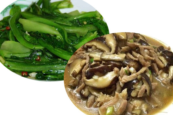 把肉取出解凍后切成肉絲,用食鹽、生抽、生粉、香油抓勻,香菇切成絲。先把肉翻炒后加入香菇翻炒,起鍋后炒青菜即可。