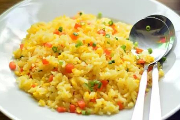 做法:把蔥一部分切段,一部分切沫,胡蘿卜切小丁,雞蛋打成蛋液;用小火先翻炒蔥段、胡蘿卜,炒至胡蘿卜斷生后放入米飯炒散;倒入蛋液大火翻炒,調(diào)入適量鹽,出鍋前撒上蔥花即可。