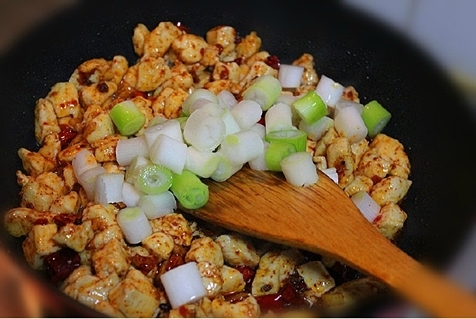 9、改成大火,將雞丁倒入鍋中,翻炒均勻。