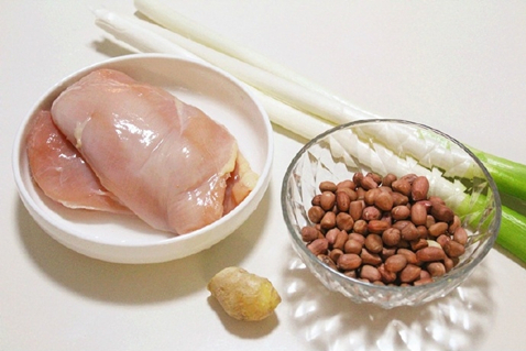 1、準(zhǔn)備食材。雞胸肉300克,花生米50克、香蔥60克、姜一小塊,蒜適量、花椒十幾粒、干辣椒幾個(gè)、辣椒面少許、食用油適量、蛋清半只、料酒1小勺、玉米淀粉適量、鹽1小勺、糖4勺、香醋3勺、醬油2勺、雞精1小勺、香油幾滴。