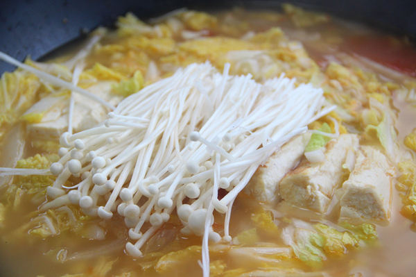 出鍋前一分鐘加入金針菇,放鹽