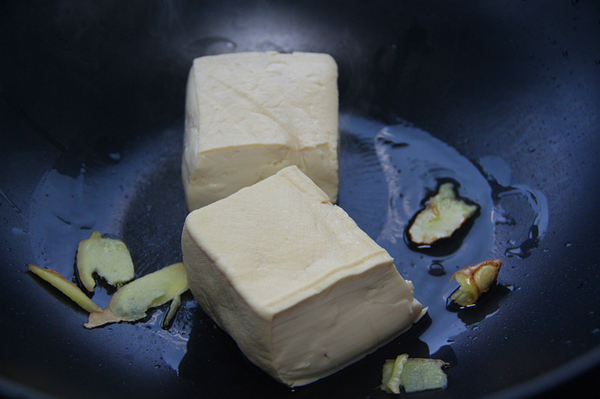 熱好油鍋之后放入生姜片爆香,放入整塊豆腐稍微煎一煎,然后出鍋