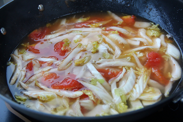 另起油鍋,放入番茄翻炒,加入娃娃菜根一起翻炒,菜葉先留著
