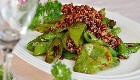 材料:扁豆400克,肉末150克、干辣椒4個(gè),老抽1大勺,榨菜末、花椒、蒜粒、鹽、味精各適量