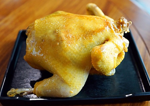 1. 買來一只清遠雞或三黃雞,清洗干凈后瀝干水分,用廚房紙把多余的水分吸一下。(最好把雞腹腔剖開但保持雞的完整形狀。)