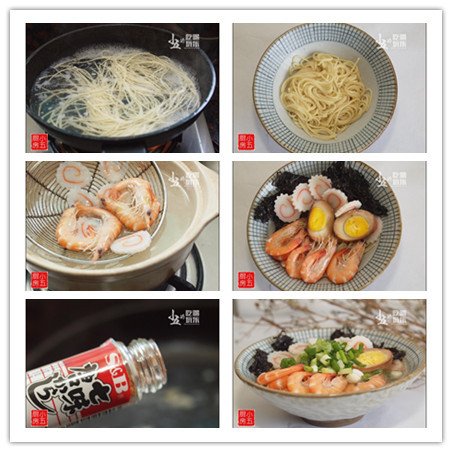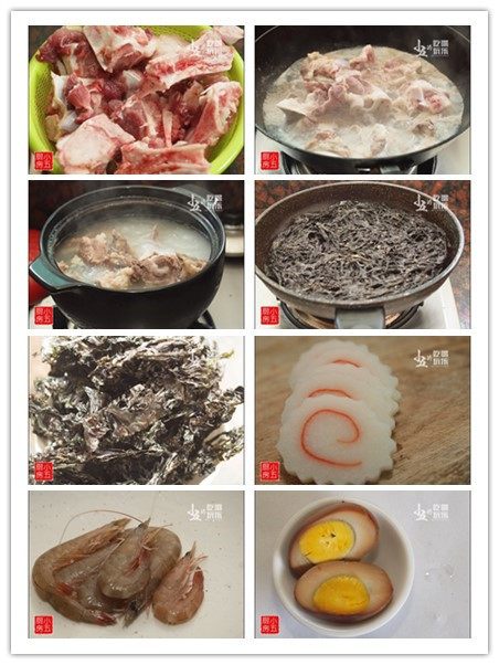【食材】豬筒骨1根、紫菜1張、魚糕1段、沙蝦6只、鹵蛋1個、拉面150g、鹽3g、蔥花1湯匙