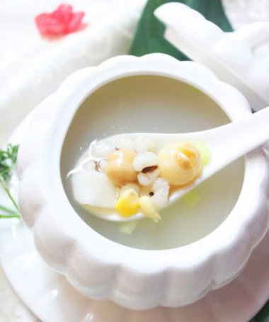 薏米蓮子湯:取蓮子20克,薏米、芡實(shí)各10克,3朵白木耳。先將蓮子、薏米、芡實(shí)放入油鍋中炒,然后加水,和白木耳一起燜熟。蓮子湯有滋陰養(yǎng)神、祛熱、驅(qū)暑的功效,老人在暑天煩熱、失眠時飲用,療效甚好。