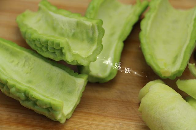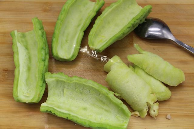 4,苦瓜的苦味來自于內(nèi)瓤和果肉之間的這層鏈接層,只需用小勺子把這層貼近果肉的綿軟組織刮去就不會(huì)有苦味,喜歡苦味的可以稍微留一些,不喜歡吃的就全刮干凈。