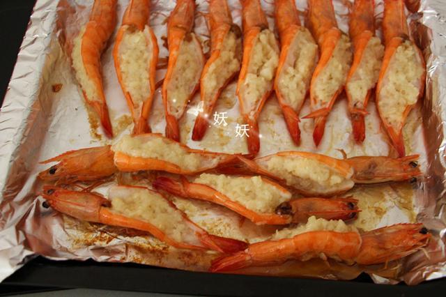 9,將蝦擺入烤盤(pán),裝上蒜蓉。