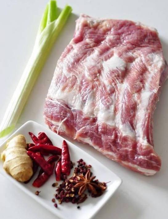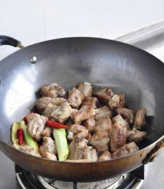 倒入排骨炒到微黃。放入干辣椒,繼續(xù)煸炒排骨邊緣焦黃