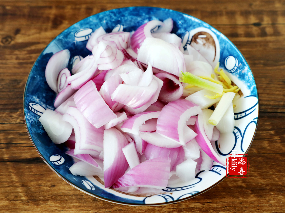 洋蔥切小片兒,生姜、蔥段兒少許備用。
